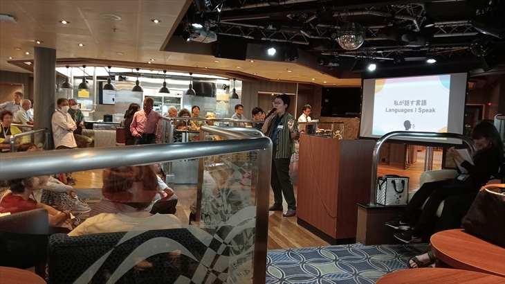 16:15から7階レジェンドバーで開催されたピースボートスタッフのバイリンガル女性の講座、満席にです。視覚・聴覚がらの学習、多言語で1つの単語をまとめて覚える、ギブアンドテイクの学習など独特の方法が興味深かったです。