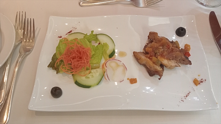 久しぶりの5階レストラン、3日毎にメニューが変わります。前菜3種、スープ3種、パスタ、魚1種、肉3種、野菜、ケーキ2種から好きなものを選びます。今回メニューにはジャマイカ名物のジャークチキンがありました。チキンチキンになってしまいましたが、食べたいものを頂く贅沢です。食事は個人的には5階レストランは1回/日が良いですね。