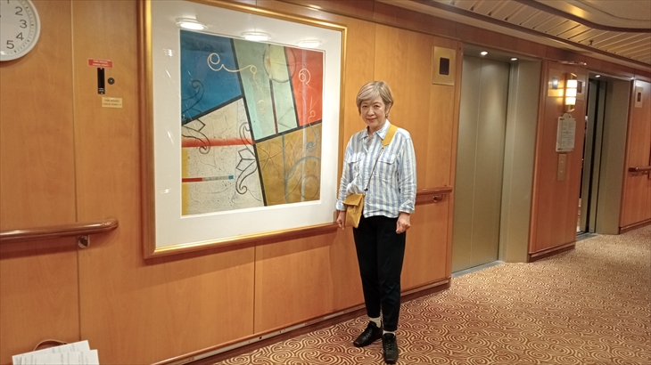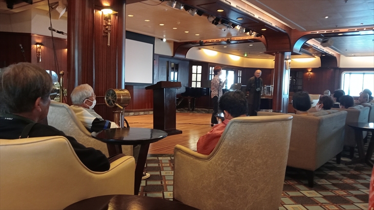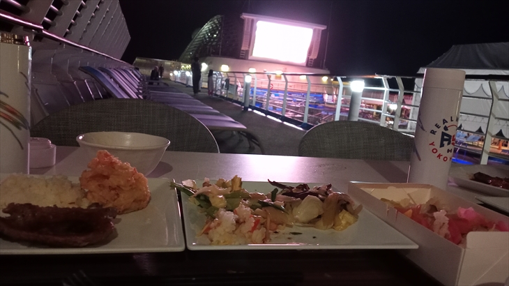部屋のバルコニーでビールを飲んで、14階のオープンデッキで大型ビジョンに投影される寄港地紹介を見ながら夕食にしました。解放感があって気持ち良かった。