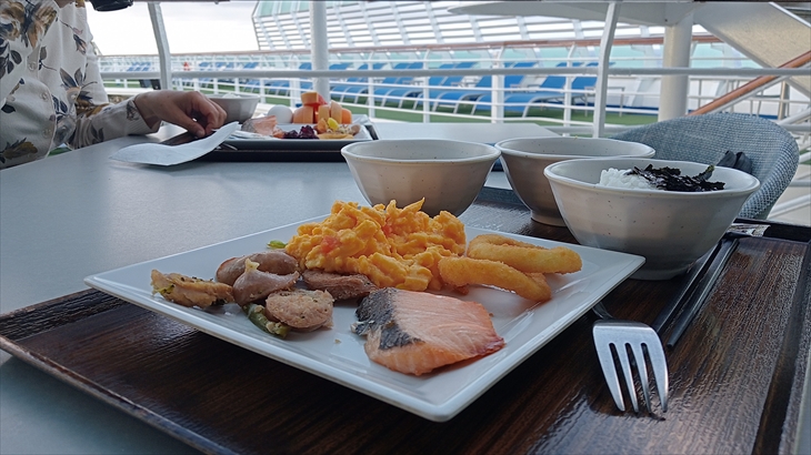 5階レストランの最終入場時間の8時30分に間に合わなかっので14階のブッフェ外の屋外波平テーブルで朝食にしました。