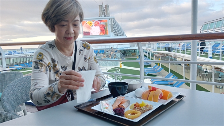 5階レストランの最終入場時間の8時30分に間に合わなかっので14階のブッフェ外の屋外波平テーブルで朝食にしました。