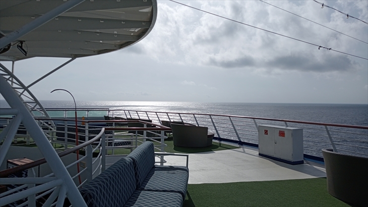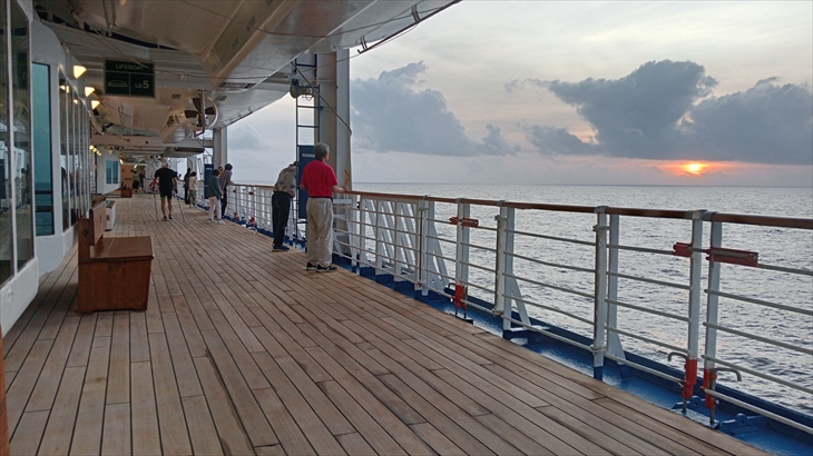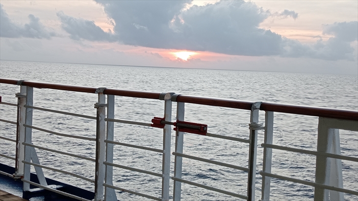 アフリカ大陸方面からの日の出は朝8時頃、7階デッキの右舷のベンチに座って毎朝眺めています。しかし、水平線からの日の出をまだ見ることができていません。今日も雲が邪魔して見られませんでした。