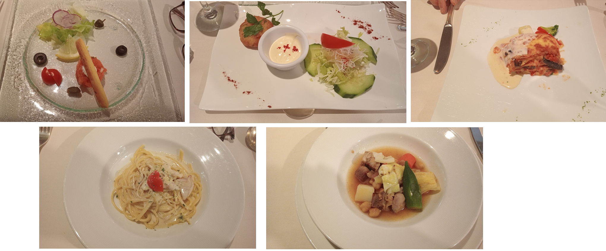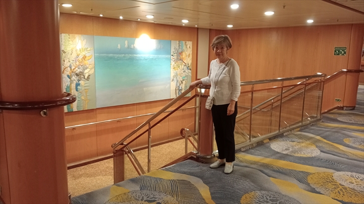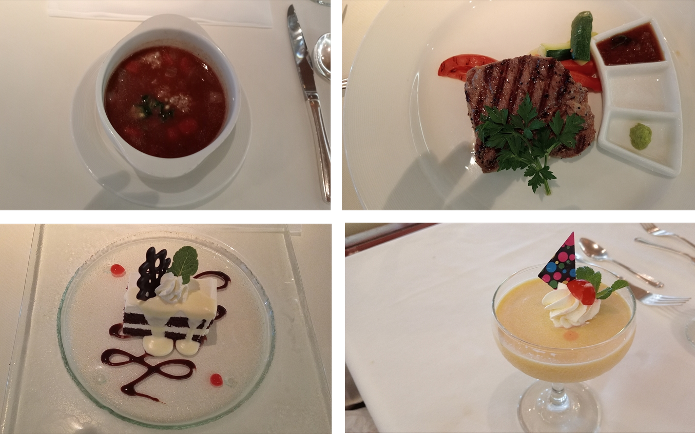 まだ外は明るい20時ころから5階レストランでディナー。4名相席、昨日の卓球大会に出場し優勝候補だった方、2回戦で優勝者と対戦して敗退。相部屋では有料ですが下段指定ができる、これは不公平ではないかという意見。また、船内生活はゆっくりしたいのでイベント参加は少なく、本を読んでいることが多い、など色々な方がいますね。声高に主張するのでなく穏やかにご意見を仰れるお方は、食事時だけの時間でも出会って良かったと思えます。とても最近は相席会話を楽しみになってきました。
