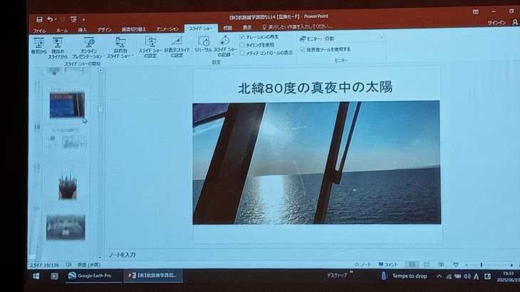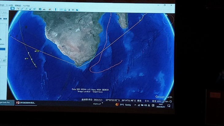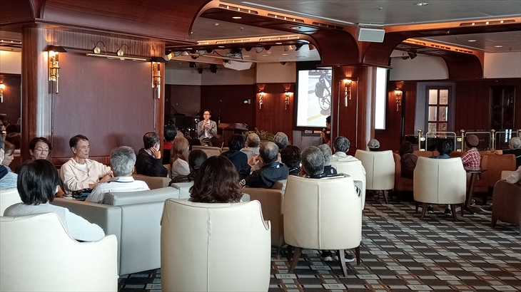 48回も世界一周を行った狭間元船長のシリーズ企画(第二回目)。南アフリカからニューヨークまでの航路紹介、フィヨルドの形成・オーロラの仕組みなど学びました。南周りの航路変更になりましたが、南へ北へと壮大なコースを辿る今。これからのハンブルクやベルゲン、フィヨルド・流氷見学など楽しみです。今の船の機械工学の紹介もありました。狭間元船長は「たいした話じゃないよ」といつも仰るそうですが、その話っぷりがお人柄表し、是非また聞きたいです。