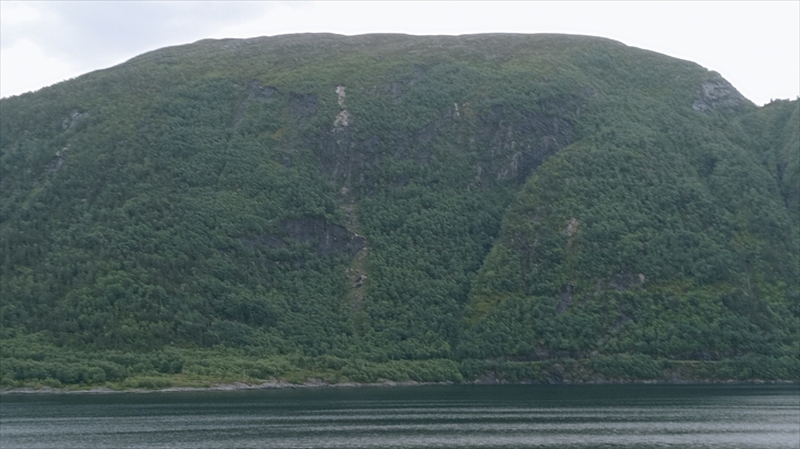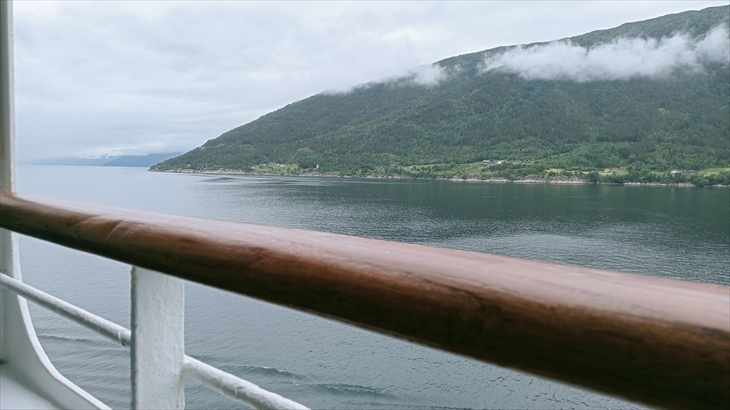 朝4時30分ころ目が覚めました。窓の外には何やら大きな島のようなものが出現しています。寒いし、眠いのでベットに横になりながらソグネフィヨルドを鑑賞。また、船は鑑賞しやすいように速度を落としてくれてます。なんという贅沢でしょう。