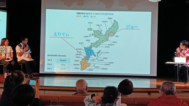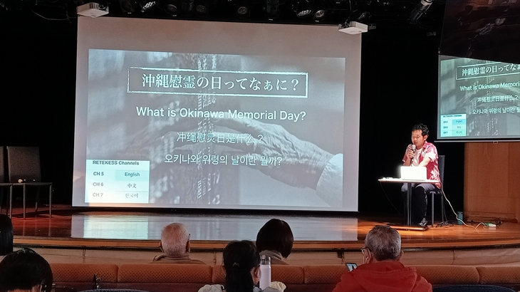 沖縄出身のゲストを2名招いて、ピースボートスタッフが沖縄の歴史や現状を説明していく企画。6月23日は沖縄激戦が終結した日で沖縄ではこの日を祝日にしています。そのような関係で今日のイベント企画は沖縄関係のものが多いようです。ゲストの一人は元小学校教師。沖縄の教育現場のお話もありました。また基地周辺の騒音の実情を体験しましたが、人が住むのは過酷です。