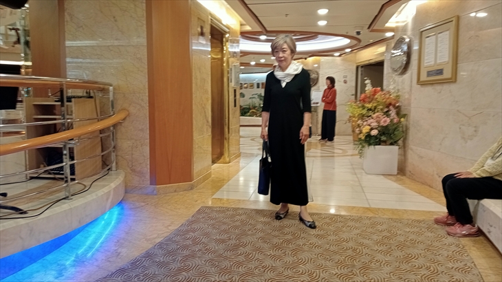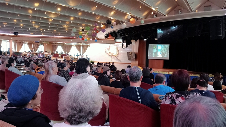 本日のメインイベントは18時30分からビスタラウンジで開催される「沖縄ライブ」。開催10分前に行きましたが満席、たまたま2席の空席を見つけ着席できたのはラッキーでした。沖縄ライブは定刻通り、エイサーから開催されました。若者に交じりチャット仲間のシニア夫婦、頑張りました。