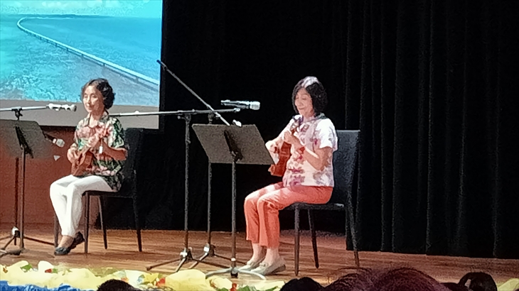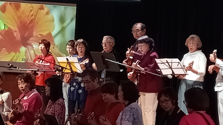 次に、チャット仲間のギター演奏Yさんが4名グループで登場、そして同じくウクレレ2名グループで透き通った声で歌うTさんが登場し、日頃の練習成果を披露しました。