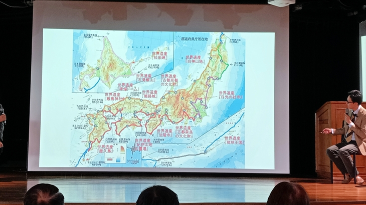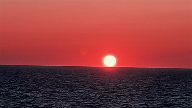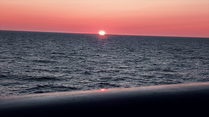 夕食は14階からテイクアウトでキャビンにて。水平線に沈む夕日が素晴らしくキレイでした。その後21時15分から8階フリースペースで、ピースボートスタッフ(船内新聞担当)による自主企画「ROAD TRIPキャンピングカーで駆け抜けたアメリカ横断」を見に行きました。同じピースボートに乗船した7名の仲間で2021年に8名乗りのキャンピングカーをレンタルし、約1ケ月かけてアメリカ横断を行った体験談。写真で紹介した訪れた観光地は知らない場所もたくさん。最後のまとめ動画の質も高く素晴らしい企画でした。