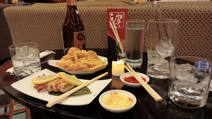 定番のサウナ&ジャグジー&プールで汗を流して少し部屋飲み。18時15分の岡さん歌声喫茶ライブでは、最近「居酒屋波平」からお料理を注文できるようになりました。イカ焼き、ポテト、枝豆をつまみに楽しみました。