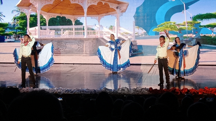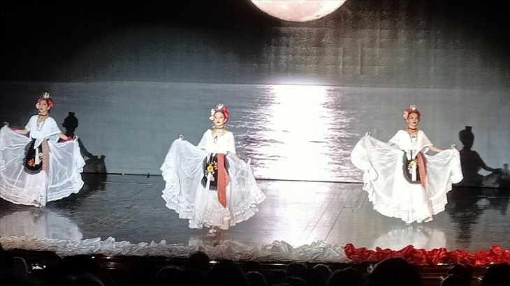 ニューヨークから乗船したメキシコ民族舞踊団は、明日の寄港地マンサニージョで船を降ります。半月の間、船内の雰囲気を明るくしてくれたメキシコ民族舞踊団のラストステージでは、4つの州の踊りを披露してくれました。団体は、養護施設のカリキュラムで、芸術に取り組む中で将来に展望を持って欲しい、との趣旨で始まりました。素晴らしい芸術と、民族の伝統の継承を担っている誇りを感じる舞台を楽しむことが出来ました。