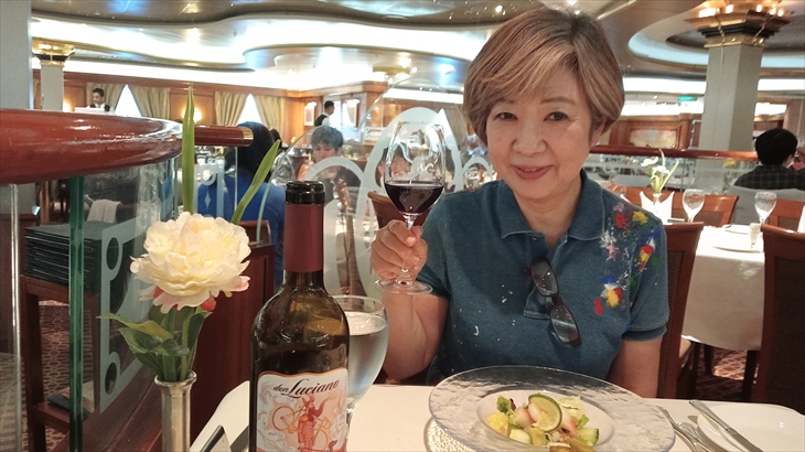 5階レストランのディナーで相方は前菜3品+ハーフパスタ+デザートにメインなし、という珍しいチョイス。赤ワインで楽しく頂きました。
