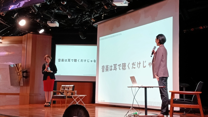 ベネズエラ生まれで日本育ち。ソプラノ歌手として国内外で演奏活動を続けながら、「ホワイトハンドコーラスnippon」の芸術監督として、視覚・聴覚に障害のある子どもたちに音楽を教えるコロンえりかさん。音楽とともに歩み、駐日ベネズエラ大使夫人として活躍するコロンさんの半生のお話をピースボートの田村さんとの対談形式で伺いました。 その前の時間の映画が乗客の感動を呼び、こちらの企画も満席です。この後コロンさんと名刺交換が出来たので、帰国したら横浜市と一緒に応援方法を考えたいと思います。