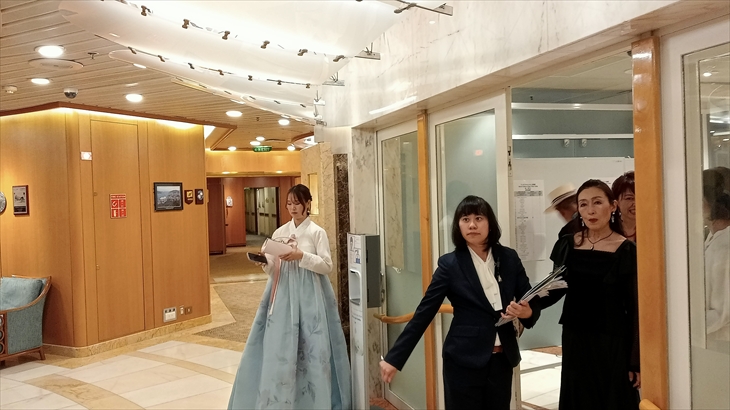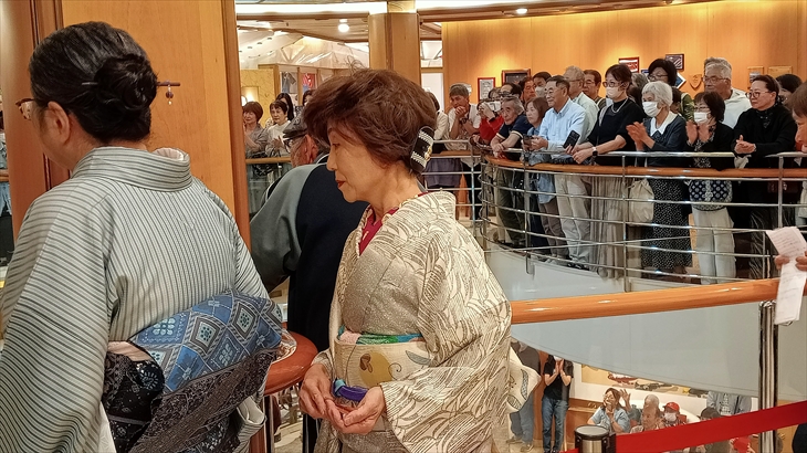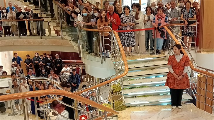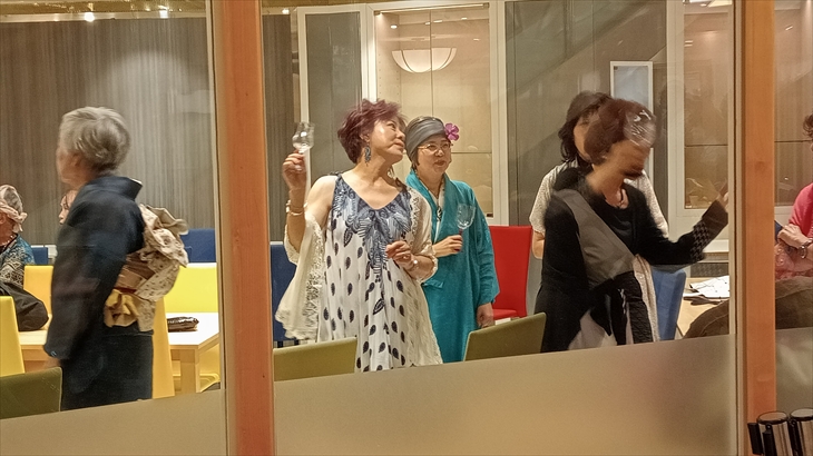 世界各地の多様な衣装を身にまとったファッションショーが開催されました。仮面舞踏会のように6階の控室から順番に5階アトリウムまで階段を降り、衣装を披露します。現地購入した衣装や、あらかじめ準備した着物や民族衣装でした。知り合いのkさんがワインを飲む会のメンバーとして参加していました。