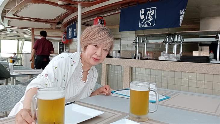 水曜日は船上のビアテラスが開催されます。初めて居酒屋「波平」に行きました。寄港地情報がエンドレスで上映されている大型ビジョンが良く見える席に陣取りました。ここからはプールで泳いでる人も見えます。最初に生ジョッキで乾杯し、枝豆、餃子などの居酒屋メニューを注文。懐かしい味です!焼酎ボトルや焼きそばなども追加注文しながら21時ころまで過ごしました。