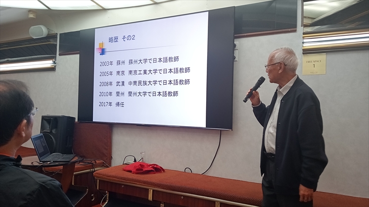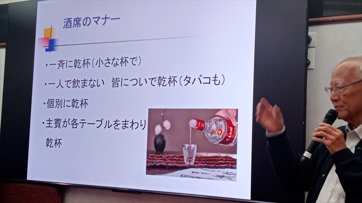 横須賀に住む、定年退職後に中国で14年間日本語を大学で教えた元SEの方の講座です。6月に学校生活についての話を聴き、2回目の今日は食事編。食事マナーは「主賓は入口から一番遠い席、主催者は主賓の隣に座り料理を取り分ける」。お酒のマナーは「最初に乾杯、勝手に飲まないで皆に注いで乾杯、乾杯したら飲み干す」など興味深い文化の紹介でした。