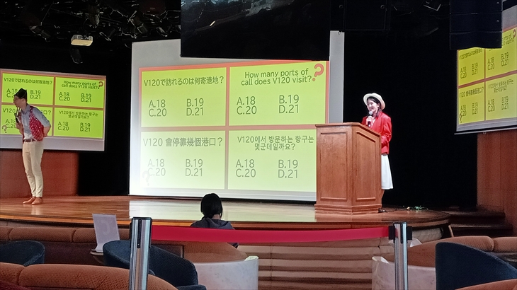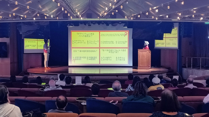 船や航海にまつわる雑学から今回の航路に関連した問題まで、知識とチームワークが試される洋上ならではのクイズ大会が7階後方のビスタラウンジで開催されました。最後の問題は「今日は横浜から何日目の航海でしょうか?」答えは85日、毎日ブログ更新しているのですぐ分かりました。