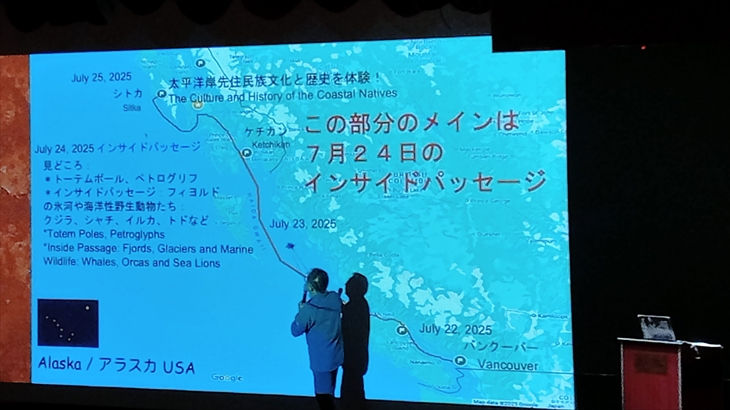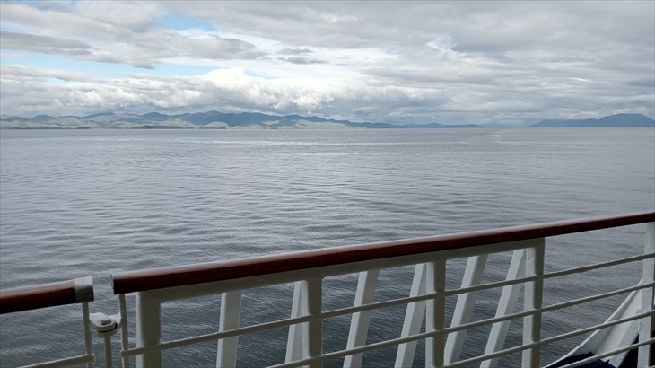 2025年7月24日(水)曇り時々晴れ。船旅はインサイドパッセージと呼ばれる野生海洋動物の宝庫である航路を次の寄港地シトカに向け北上中です。船内では「見た?」が合言葉。また、本日のメインイベントは21時から開催されるアイドルファイナルライブです。