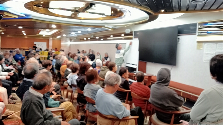今回クルーズの自主企画有名人はFさんと◯さんです。藤原さんは雑学を披露し、毎日のように8階で講座を開催しています。今日のテーマは「船旅の疑問Q&A」で参加者の質問に答える内容。「ピースボートスタッフについて教えて?」という質問がありました。CC(通訳)と水先案内人は無給ボランティアですが旅費は無料、水先案内人は人によりキャビングレードが変わるようです。また、乗客として乗船しボランティア活動する人もいるようです(映像スタッフ等)でもこれは船内新聞で募集しているので、みんな知ってますけどね。