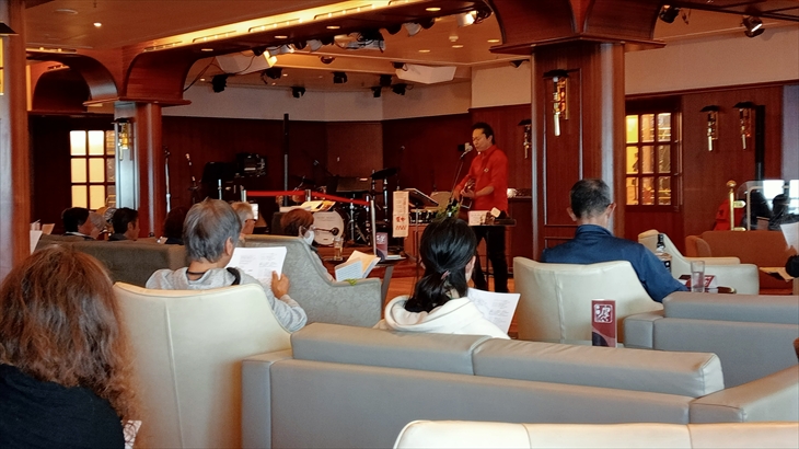 まだ明るい14階での夕食後、21時からプリンセスシアターで「V120アイドルファイナルライブ」が開催されました。若者達の活動の集大成として、練習の成果を見せてくれました。新しいチームが出来たり、パーフォーマンスが向上したダンスだったりとても楽しかったです。