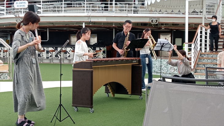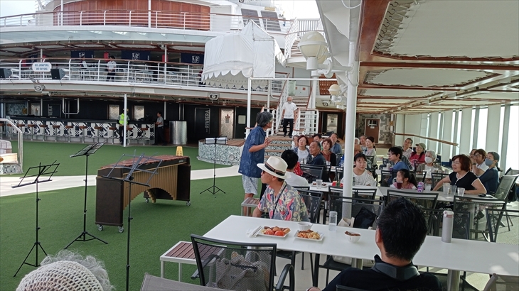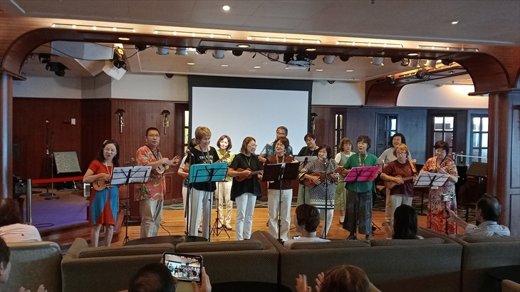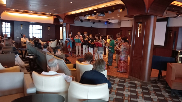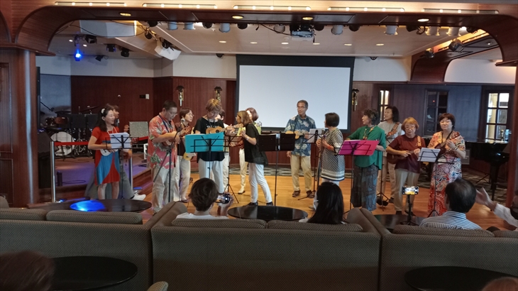本日のメインイベントの一つ、チャット仲間のウクレレ&歌によるミニライブが7階のホィールバーで開催されました。芸達者祭などの公式発表会だと約3分の時間制限があるので、自主企画で約1時間の発表会です。