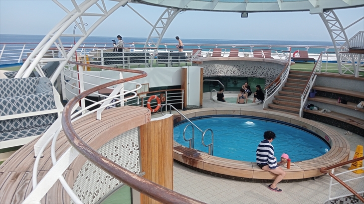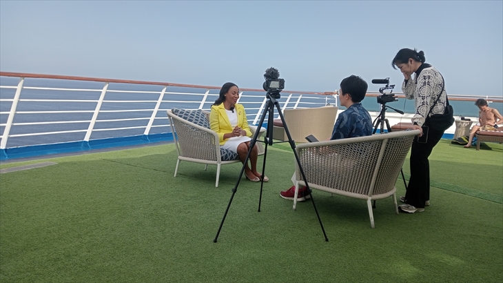 サウナ&ジャグジーは毎日の日課になってきました。プールの水温は28℃なのでサウナの後はプール、そしてジャグジーで温まります。先ほどの駐日ジャマイカ大使がピースボートスタッフのインタビューを受けていました。