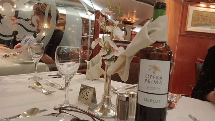 夕食は19時45分から5階レストランで今日もプライベートで赤ワインです。夕食レストランではワインが欠かせなくなってきました。またクルーも覚えてくれています。何か対応が違います。