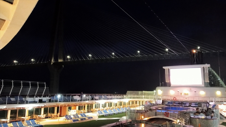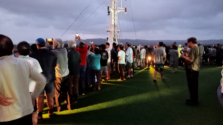 外はまだ暗い5時30分頃、14階デッキではパナマ運河通過するための最初の閘門「ガツン閘門」が見えてきました。船首は人で溢れています。