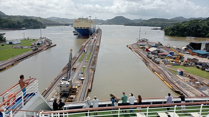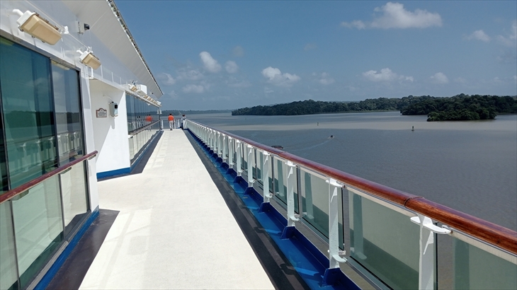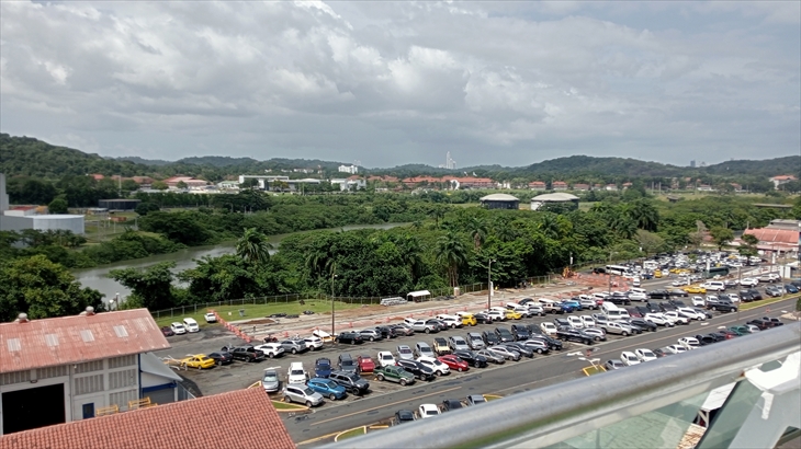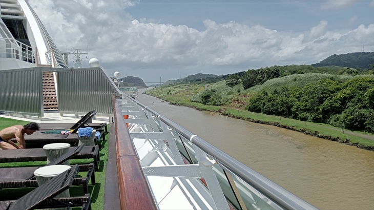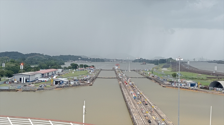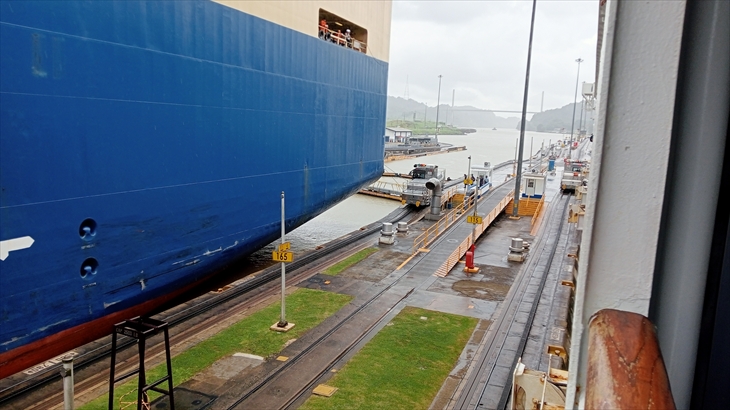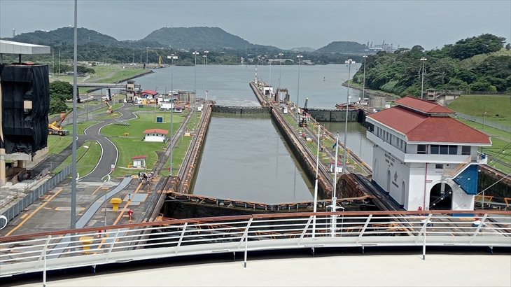 太平洋側に位置し、2段階の閘室で構成されてるミラフローレス閘門です。まず5階で想像よりゆっくりと下降する様子を確認。次に9階キャビンへ移動し、後方から来た大型船が小さな列車に牽引される様子や、閘室の水が放水され水位が下がっていく様子を、ベランダから見学しました。