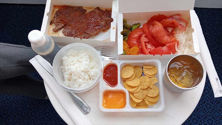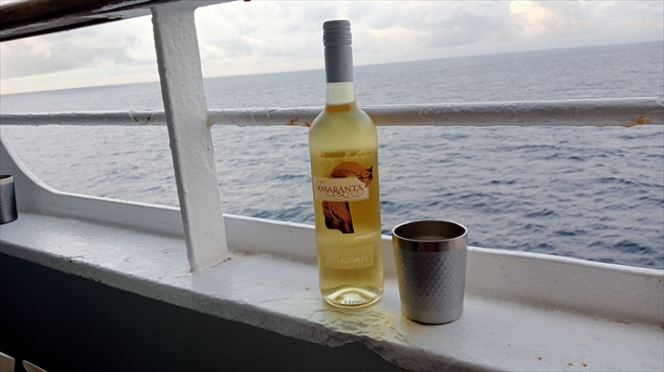ベルゲンで購入したスモークサーモン、クリストバルのナチョスと14階から調達したランプステーキ・メンチカツ・サラダ・パンをつまみにキャビンのベランダで18時20分ころから夕食。少し甘めの白ワインがお供。暗くなるにつれ涼しくなり、太平洋の大海原を眺めながらの夕食は最高の贅沢です。