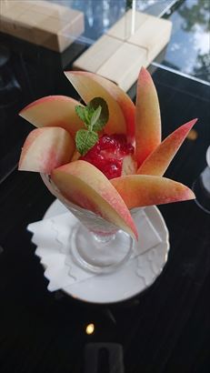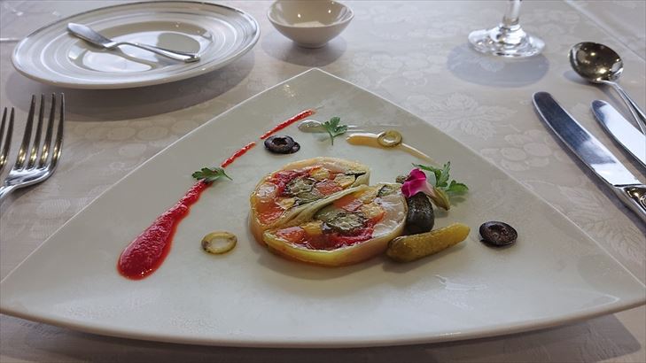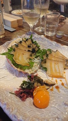 夕食はぶどうの丘のレストラン、グラスワイン片手に美味しくいただきました。