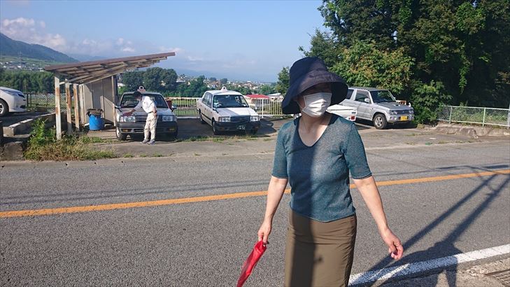 朝早起きして6時30分ころから広大なぶどう畑の中を約1時間散歩、振り返るとぶどうの丘はいつの間にか高台に見えます。タクシーを拾いたいけど、勝沼中心街ですが、こんな交通量の少ない場所にはタクシーは走りません。どうしようと思っていたところ、奇跡的偶然にタクシー会社「勝タクシー」の看板発見。
