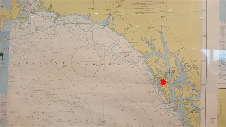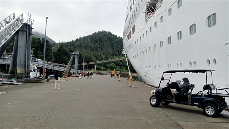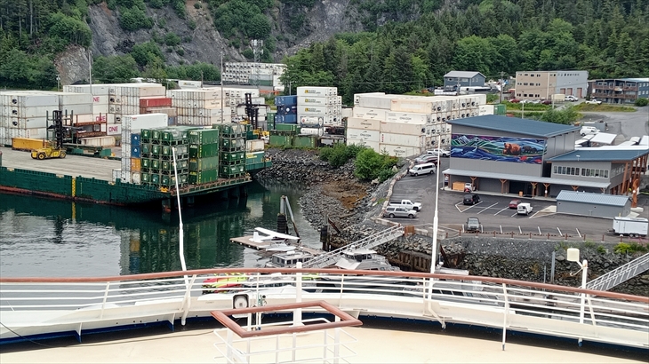 6時少し前に船が寄港地に近づいていることを知りました。どんよりした曇り空の中、周りの風景はアラスカ独特です。船は予定通り7時に小さな桟橋に着岸しました。