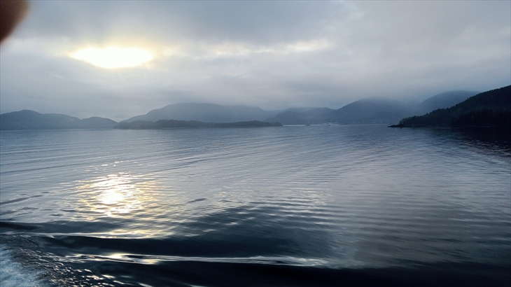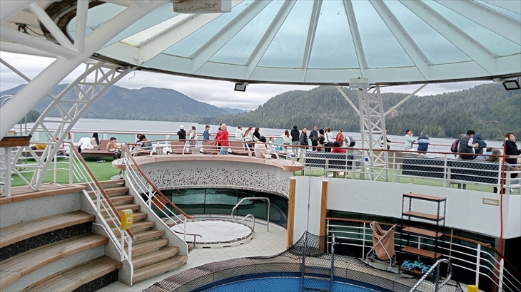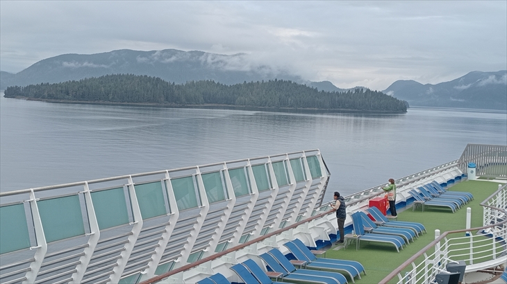 2025年7月25日(金)晴れ時々曇り。360°水平線だった周りの景色はアラスカの島々に変わりました。船は北上を続け、クジラを探しながらの旅は寄港地シトカで少し休憩です。