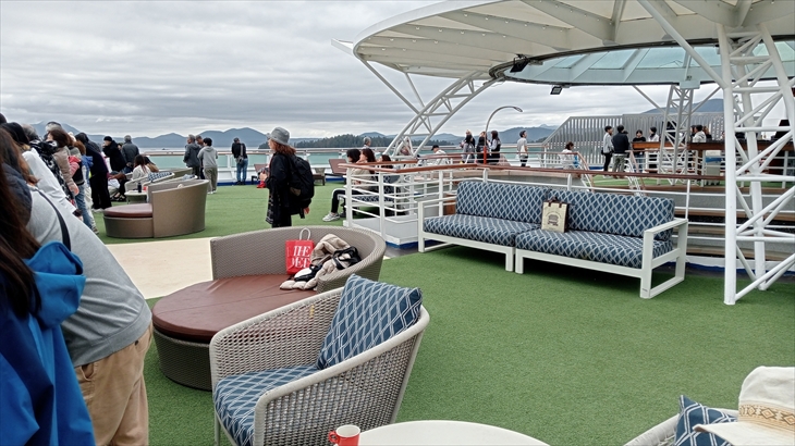 船は15時45分ころ離岸、14階船尾で出航式が行われました。その後、チャット仲間と14階でLINE連絡について話合い、就寝しました。
