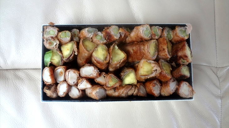 おかずは、子供達が大好きな唐揚げ、サツマイモ・アスパラ・ささみ等の肉巻きとウインナーです。そしてデザートはシャインマスカット・巨峰ブドウの豪華版です。