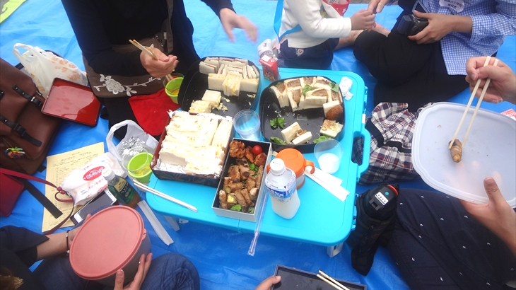 午前中の演技が遅れたので50分間予定されていたお弁当時間は35分位。この日のために生協で購入した簡易テーブルにお弁当を広げ急いで食べました。同じテーブルの家族もチラホラ。