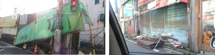 次の日、車で近所を確認するとトタン板が吹き飛んだり、お店の看板が壊れてしまったなどの爪痕があり横浜市の臨時清掃車が大活躍していました。