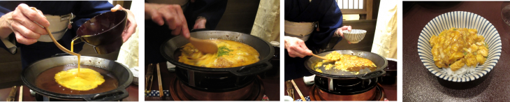 最初にお肉だけを1枚づつ調理、溶き玉子にお肉を入れ一人づつ盛り付けしてくれます。同じ手順要領で2枚目のお肉と野菜を盛り付けてくれました。