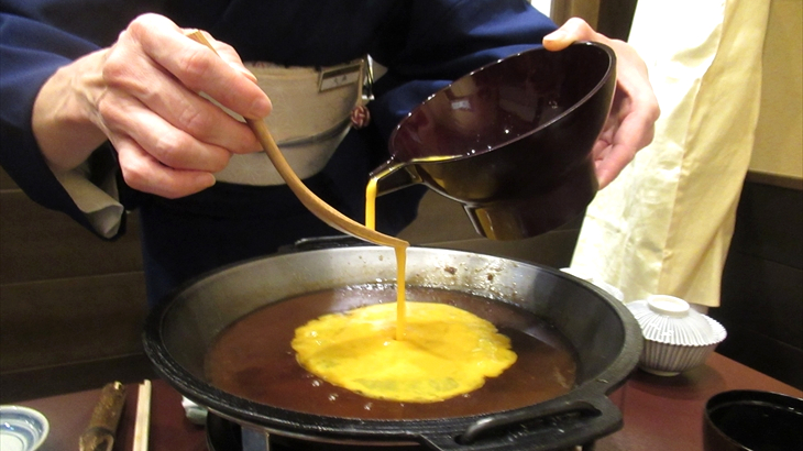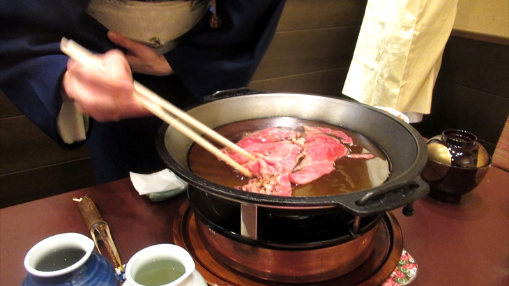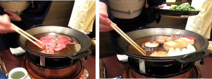 すき焼き鍋に割りしたを投入し水平調整、割りしたは約5ミリ程度投入し火力を調整しながら温めるという感じ、決して沸騰させません。