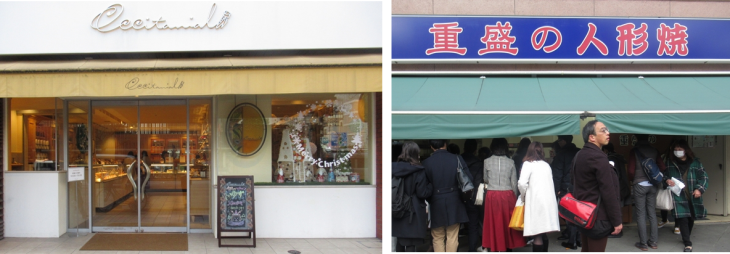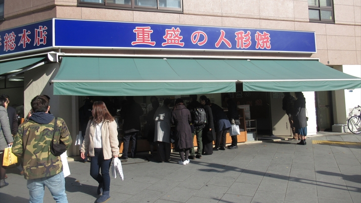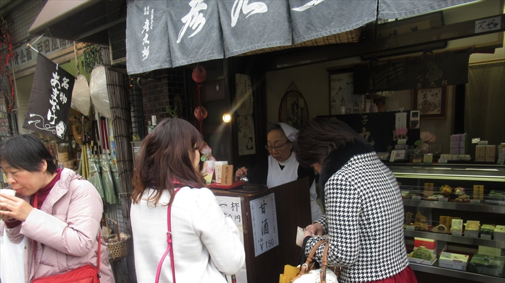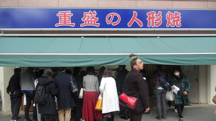水天宮交差点を渡り、七福神のお顔が愛らしい人形焼を販売している「重盛」は行列。少し並んで数家族分買いました。人形町のすき焼き・しゃぶしゃぶ専門店「今半」を確認し、甘酒横丁で甘酒を頂き、タクシーで日本橋まで向かいました。
