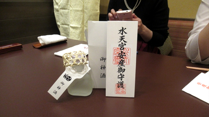お料理が来る前に、水天宮で頂いた物を明けてみることに、腹帯、お守り、猫のガラス瓶に充填されたお神酒などを確認し、写真に修めておきました。