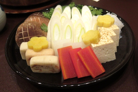 お豆腐、椎茸、今半の刻印が刻まれているお麩、下ゆでした人参、ネギを3人分煮込んで取り分けてくれました。そして最後のお肉を新しい溶き玉子で頂きすき焼きはほぼ終了。
