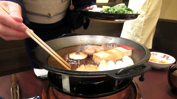 小鉢2皿、お刺身の2点盛りを食べると、メインのすき焼きの素材と調理してくれる仲居さんが登場。