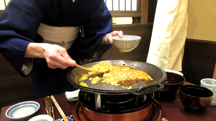 最後に、残ったお肉と野菜の出汁がたっぷりの割したに6個の溶き玉子を丁寧に投入し、割りしたと玉子を一体化させ白米に乗せ、〆のミニ玉丼が完成しました。