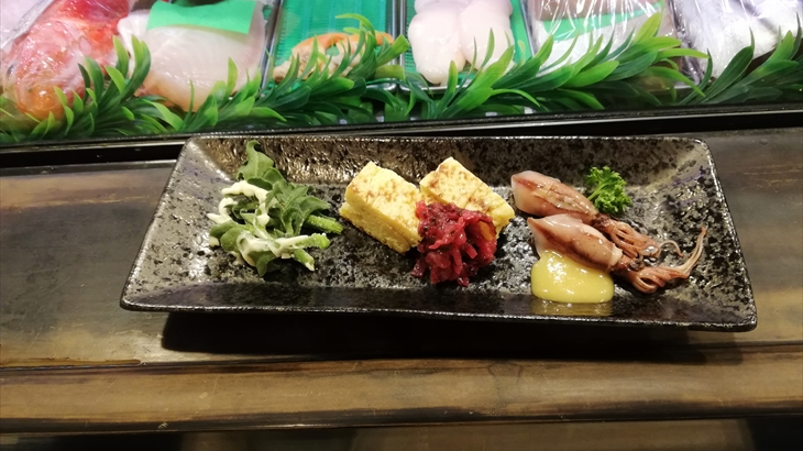 ホタルイカ・たまご・野菜の3点盛り前菜、小学生にはホタルイカは苦手なようでした。タコとキュウリの酢の物が登場、これも小学生には飲み込むのが苦手なようでした。ここまでは小学生にとってワーイという感じではないようです。