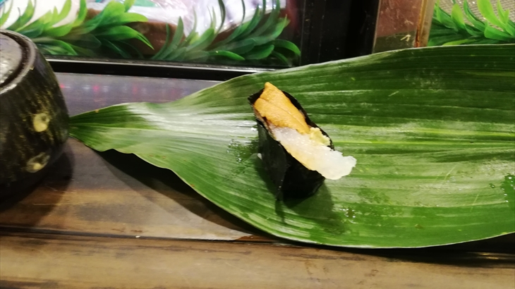 いよいよお寿司の出番、中トロ握り・イクラ軍艦・うに軍艦と高級食材で攻めてきました。次は大きな海老の握り、お吸い物をはさんで穴子握りが登場しお寿司タイムは終了。