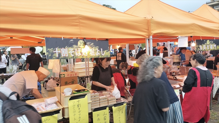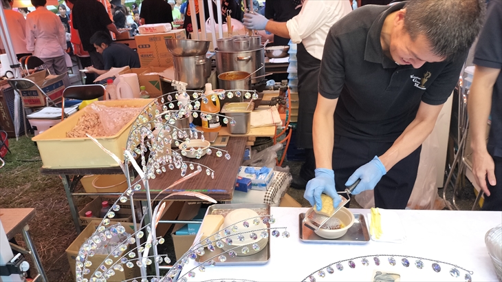 芸者バーで飲み物を購入し、テントの席を確保して、地元名店のグルメを買い出しにいきました。うかい特選牛ボロネーゼ、やまぼうしのハンバーグと唐揚げ。とても美味しかったです。