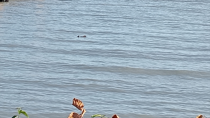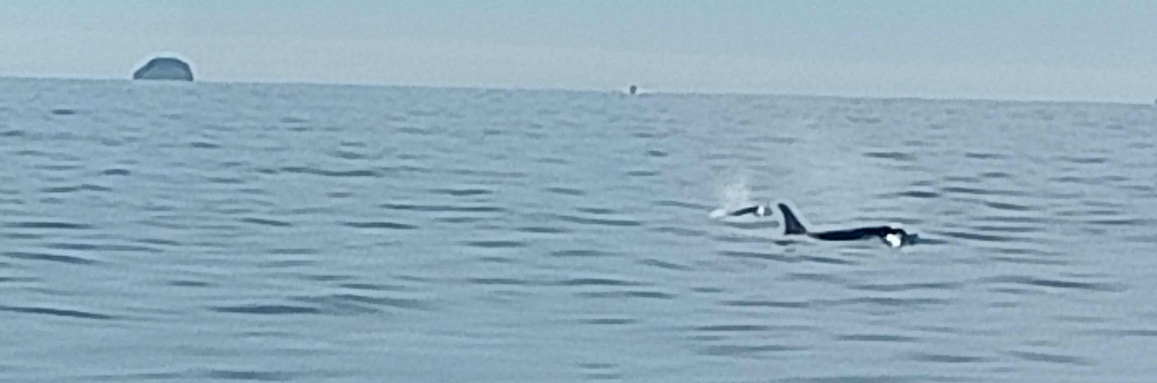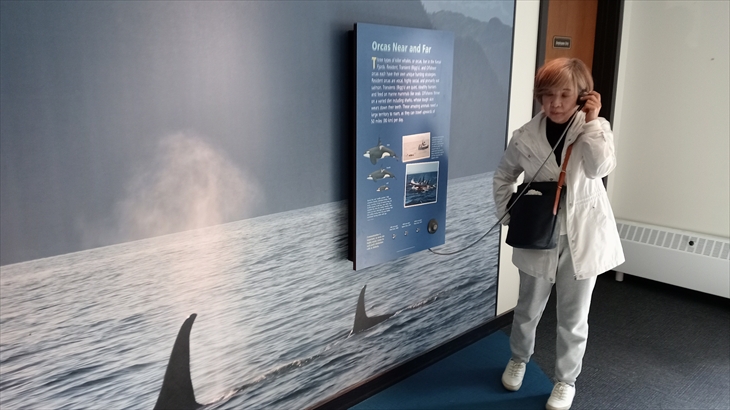 14時20分、イルカが見学できるポイントでは10分ほど船は漂います。三角の黒い背びれを探します。見つけると少しジャンプしたり潜ったりするイルカを見学できました。これはイルカ?シャチ?一階の乗客は全部アメリカ人、説明も英語のため周囲に同意を求められません。多分シャチです。