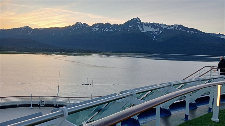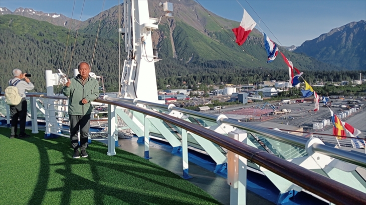 20時40分、船は離岸し思い出深いアラスカスワードを出発し横浜に向かいます。14階に行きました。船尾ではスタッフが出航風景を眺めています。